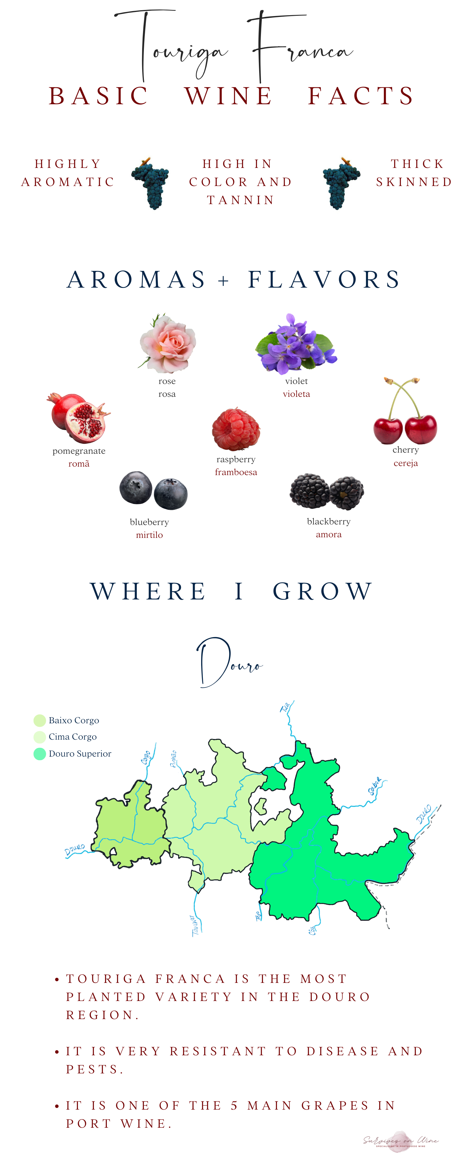 A Touriga Franca é uma casta extremamente importante na produção vinícola portuguesa. Como pode ver, incluí o mapa de vinhos do Douro para saber onde cresce, no entanto, este não é o único sítio onde cresce. Mas, é a casta mais plantada na região do Douro, correspondendo a 1/5 de todas as plantações. Além disso, acredita-se que é originária do Douro, por isso, mereceu o espaço do mapa no meu gráfico. A touriga franca é plantada em todo o país, mas é uma casta importante nas regiões do Douro, Trás-os-Montes, Beira Interior, Dão e Alentejo.